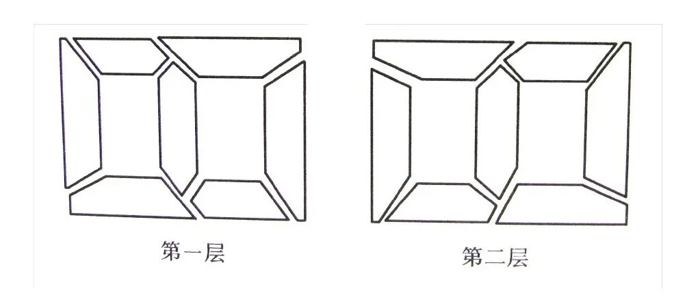 如圖2所示。用于冷軋取向硅鋼片,此種接縫的特點是直接縫和斜接縫在鐵心疊片中交替出現,芯柱片與鐵軛片寬度一致時,斜接縫為45°搭接面積占角部的50%,磁性能比直接縫有明顯的改善,結構可靠,剪切和疊積也方便,硅鋼片利用率高。但因還有一部分為直接縫,沒有完全利用冷軋取向硅鋼片的方向性,因此還不能使鐵心的空載損耗降低到最小。
